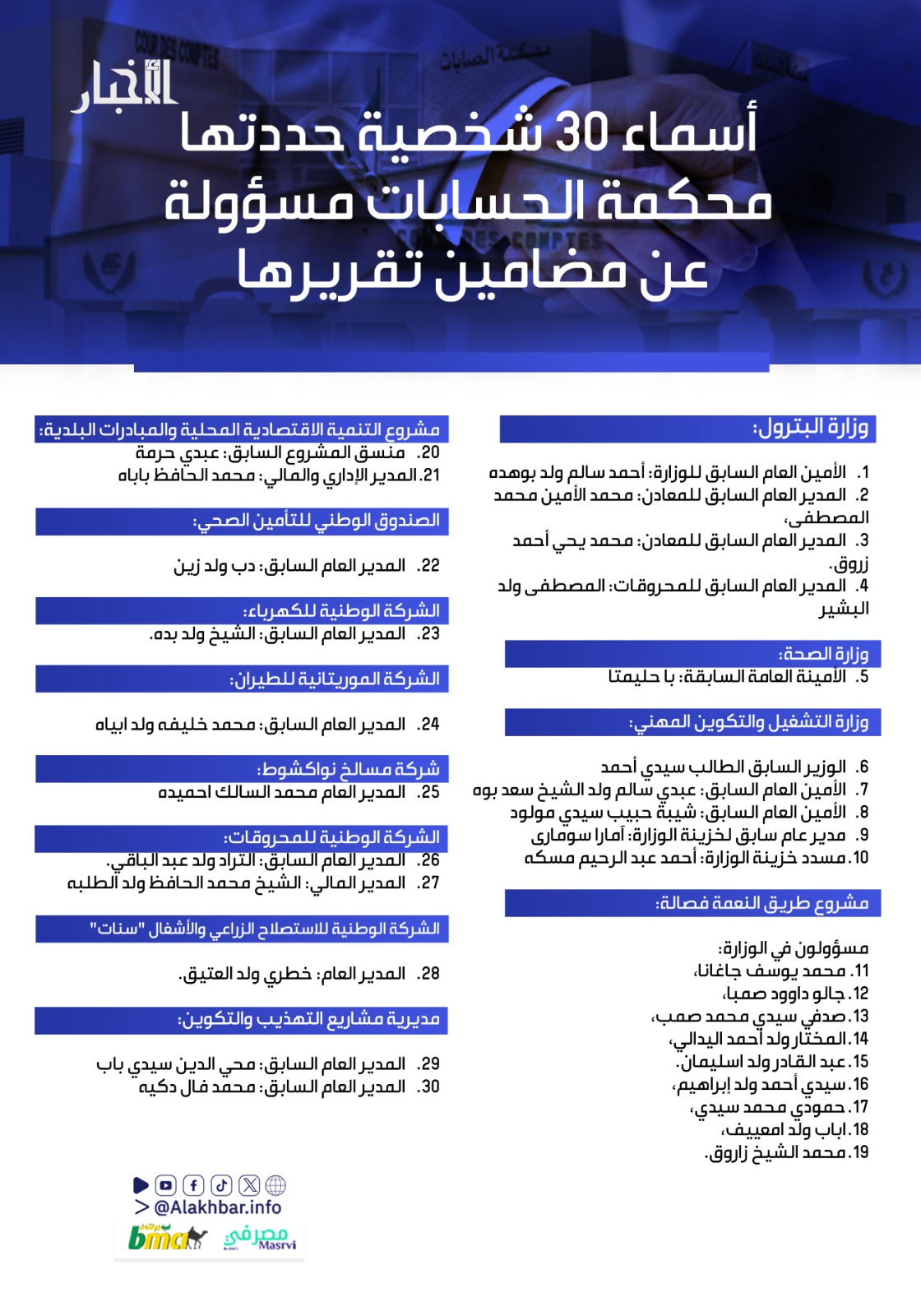 الأخبار (نواكشوط) – حصلت وكالة الأخبار المستقلة على اللائحة التي سلمتها محكمة الحسابات للحكومة باعتبارها مسؤولة عن أبرز الوقائع التي يمكن أن تشكل أخطاء تسييرية طبقا للقانون.