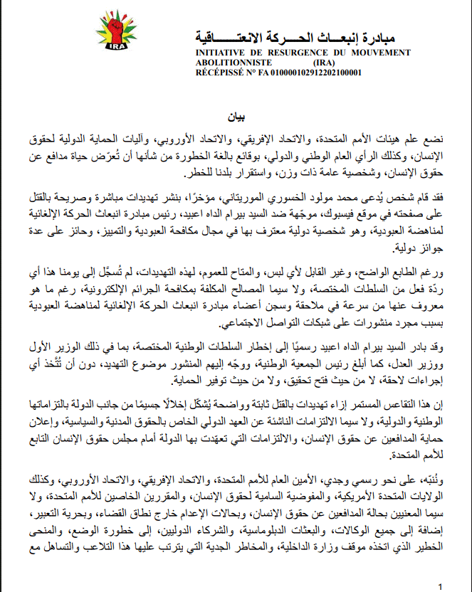 الأخبار (نواكشوط) قالت حركة (إيرا) إن رئيسها بيرام الداه اعبيد تعرض لتهديد مباشر وصريح بالقتل من شخص يُدعى محمد مولود الخسوري في منشور عبر فيسبوك، مضيفة أنه تم إبلاغ السلطات لكنها لم تتخذ أي إجراء.