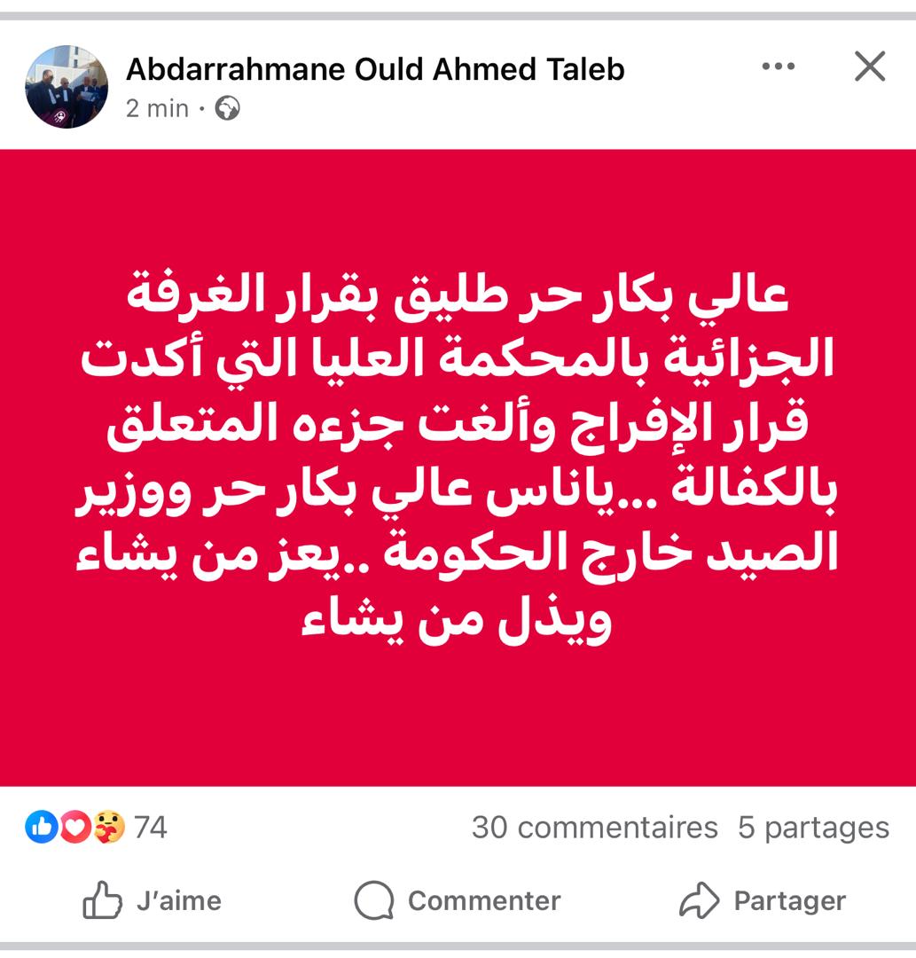 وأكد عضوُ دفاع ولد بكار المحامي عبد الرحمن زروق في تدوينة على حسابه في فيسبوك أن المحكمة العليا أكدت قرار الإفراج عن موكله، وألغت جزأه المتعلق بالكفالة.