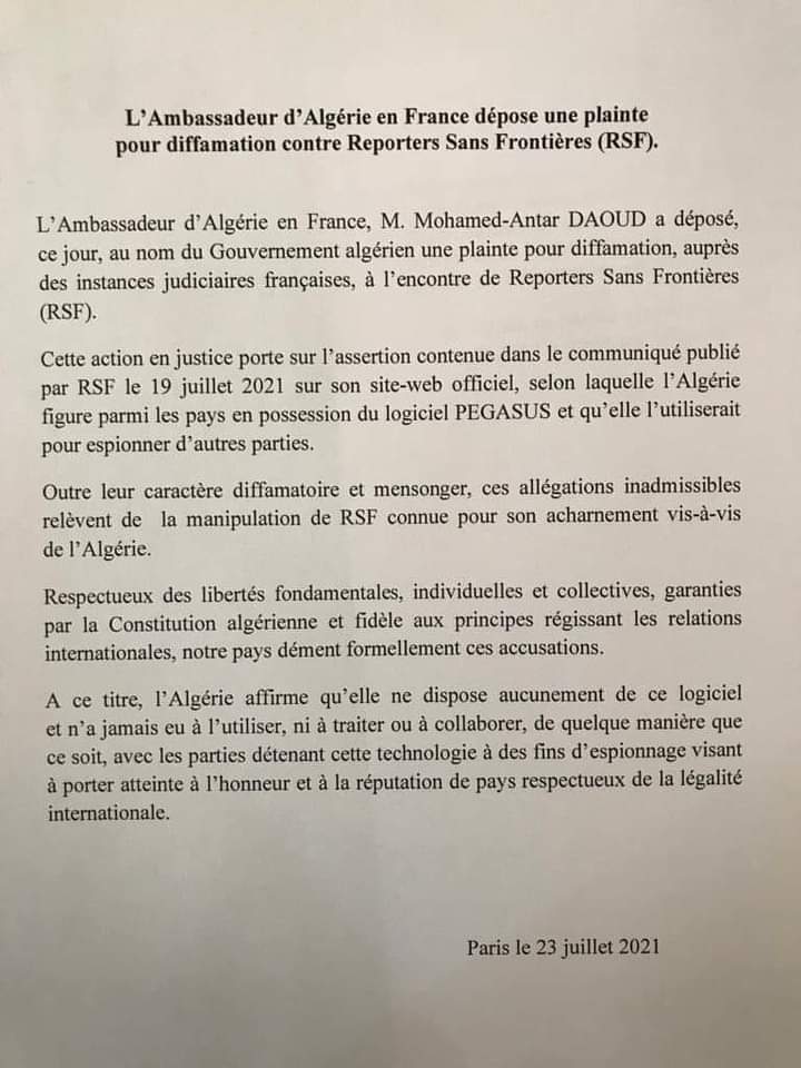 وبحسب بيان صادر عن السفارة الجزائرية بفرنسا، فإن الدعوى التي تم تقديمها أمام القضاء الفرنسي، تتعلق بالبيان المنشور على الموقع الإلكتروني الرسمي للمنظمة يوم 19 يوليو 2021، والمتضمن “ادعاءات بأن الجزائر تعد ضمن الدول التي تملك برنامج بيغاسو وتستعمله للتجسس على أطراف أخرى”.