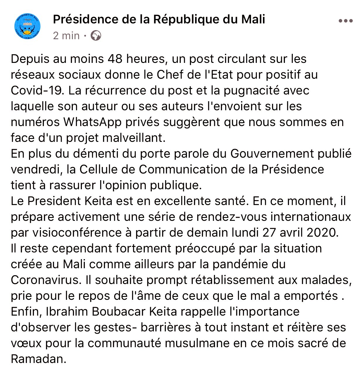 وكانت الحكومة المالية قد أعلنت قبل يومين أنها ستتقدم بشكوى أمام النيابة العامة ضد مجهول، زور بلاغا باسم وزارة الصحة، ونشره، يتحدث فيه عن إصابة الرئيس ونجله، ورئيس الحكومة، وعدد من النواب بفيروس كورونا المستجد.