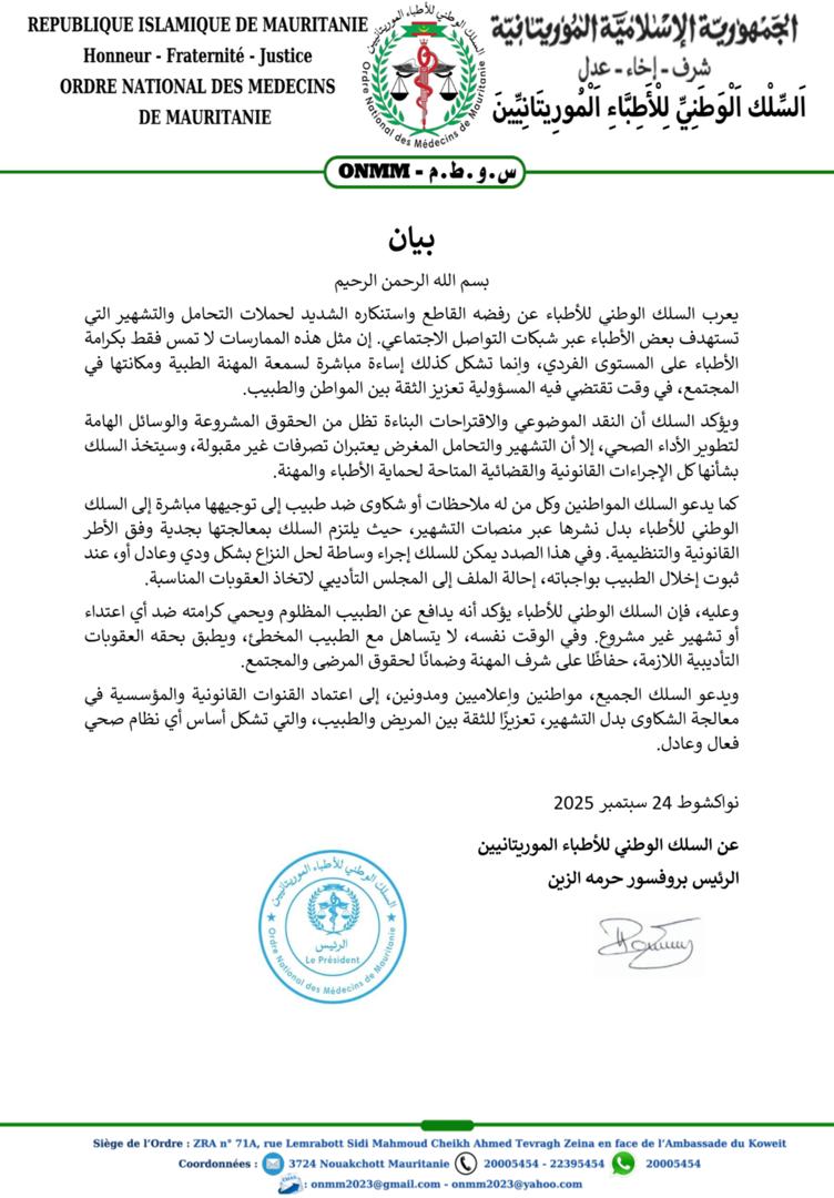 الأخبار (نواكشوط) – استنكر السلك الوطني للأطباء ما قال إنها “حملات تحامل وتشهير تستهدف بعض الأطباء عبر شبكات التواصل الاجتماعي” مُعربا عن رفضه الشديد لهذه الحملات.