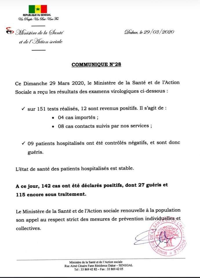 وجددت وزارة الصحة في بيانها الدعوة للمواطنين السنغاليين، ب”الاحترام الصارم لإجراءات الوقاية الفردية والجماعية”.