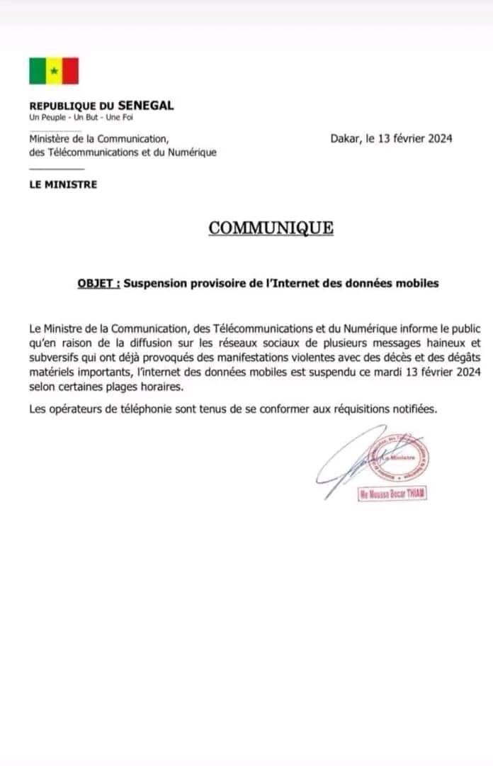 وأرجع بيان لوزارة الاتصال السنغالية سبب قطع الأنترنت إلى “نشر العديد من رسائل الكراهية على شبكات التواصل الاجتماعي، ما سبب خروج مظاهرات عنيفة، خلفت قتلى وخسائر مادية هامة”.