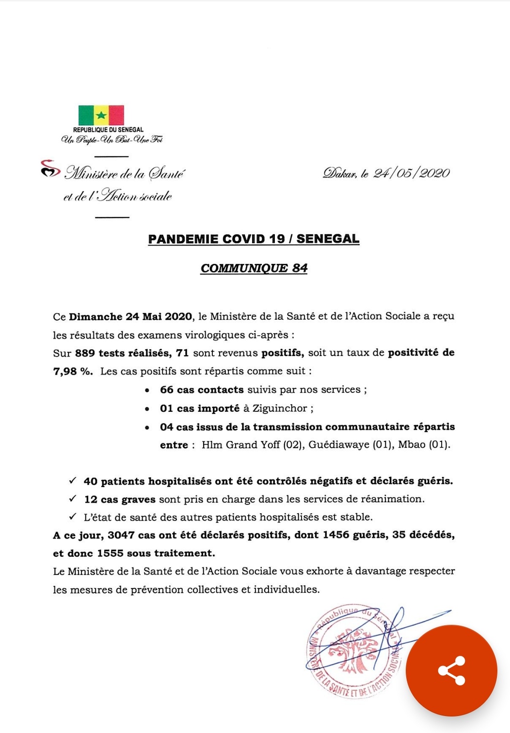 الأخبار (داكار) – أعلنت وزارة الصحة السنغالية، اليوم تسجيل 71 حالة إصابة جديدة بفيروس كورونا المستجد، رفعت إجمالي الإصابات في البلاد إلى 3047 إصابة مؤكدة.