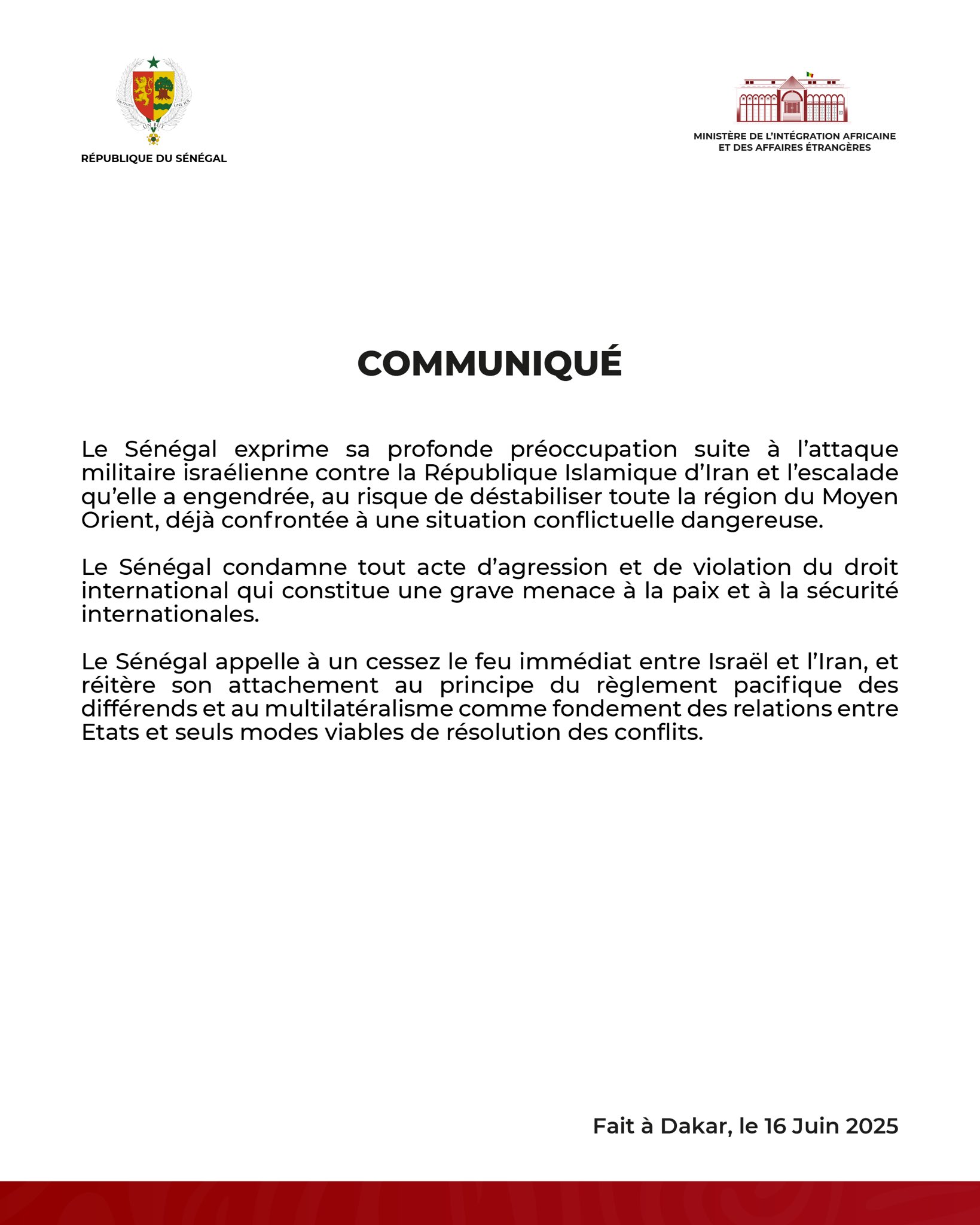 ودعت الخارجية السنغالية إلى “وقف فوري لإطلاق النار بين إسرائيل وإيران”، مجددة التزامها “بمبدأ التسوية السلمية للنزاعات، وبالتعددية كأساس للعلاقات بين الدول والوسيلة الوحيدة الفعالة لحل الصراعات”.