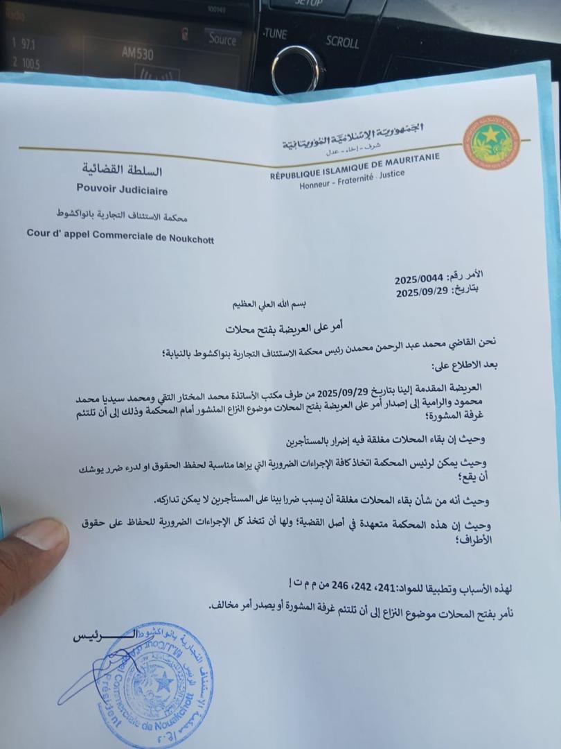 الأخبار (نواكشوط) – أمر رئيسُ محكمة الاستئناف التجارية بنواكشوط بالنيابة القاضي محمد عبد الرحمن محمدن بفتح محلات تجارية موضوع نزاع في سوق السبخة المركزي.