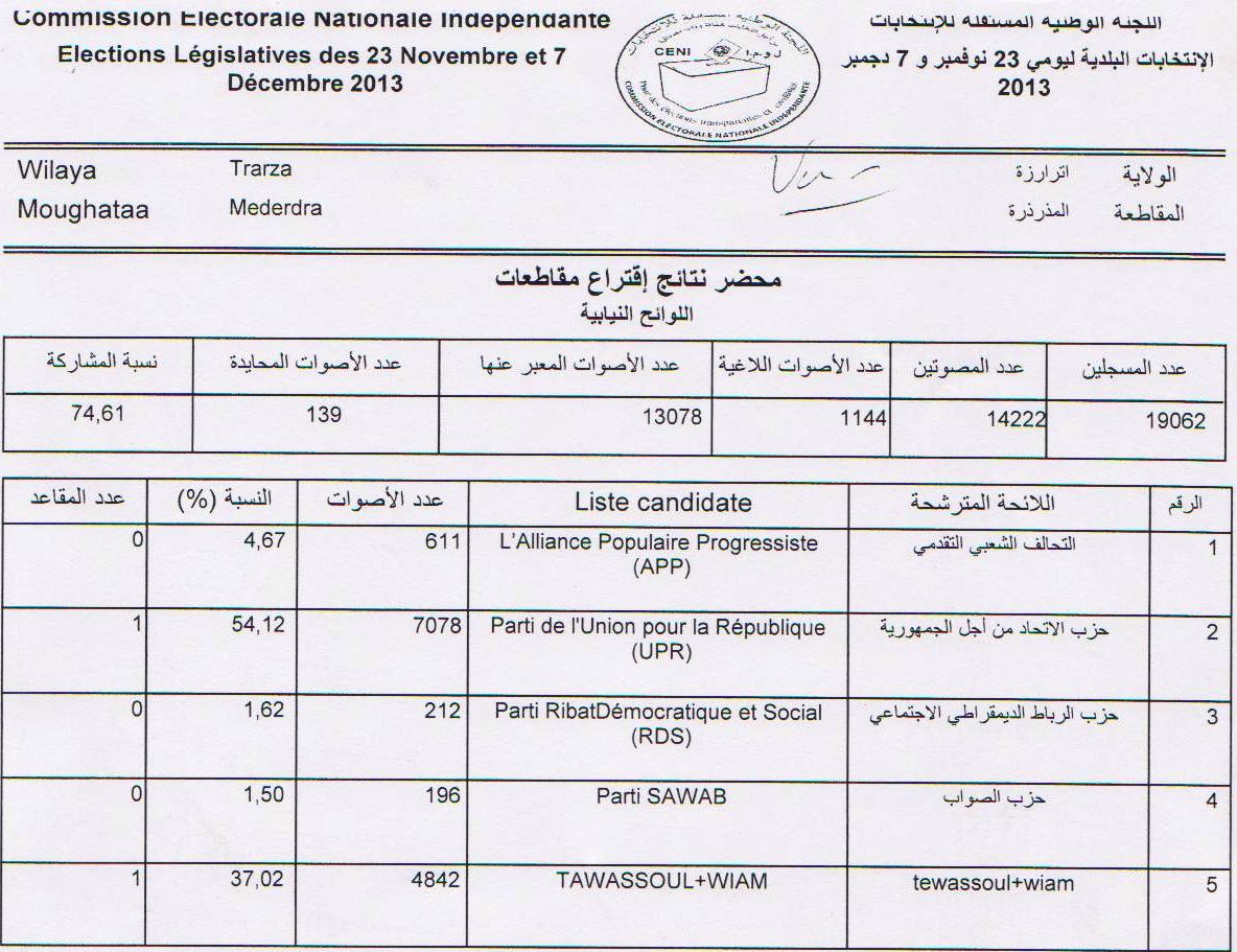 اللجنة منحت حزب الاتحاد من أجل الجمهورية أحد نواب المقاطعة بنسبة بلغت 54.12% ، بينما منحت النائب الآخر لتحالف الوئام وحزب تواصل.