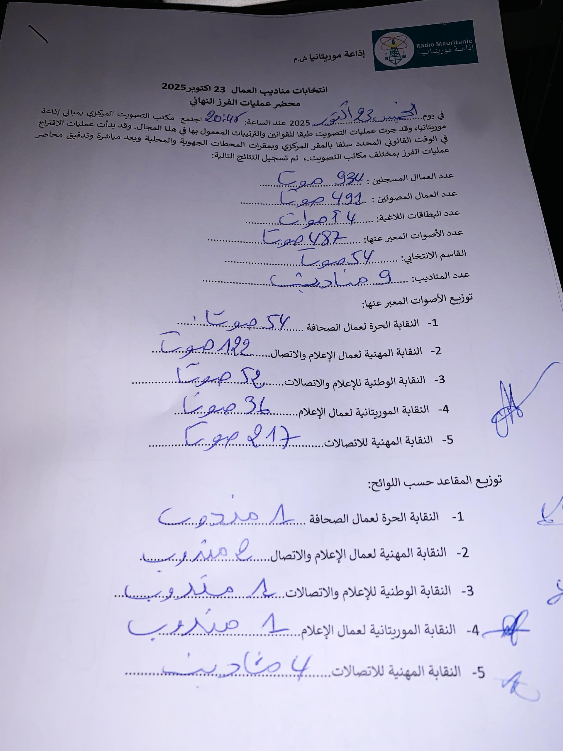 وحصلت النقابة الوطنية للإعلام والاتصال – وفق المحضر – على 52 صوتا، مقابل 36 للنقابة الموريتانية لعمال الإعلام.