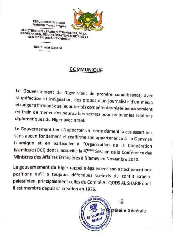 وكانت وسائل إعلام إسرائيلية قد تحدثت عن وجود محادثات بين إسرائيل والنيجر، لتطبيع العلاقات بينهما، بعد الانتخابات الرئاسية النيجرية، المقررة نهاية الشهر المقبل، والتي لا يتنافس فيها الرئيس الحالي محمدو إسوفو.