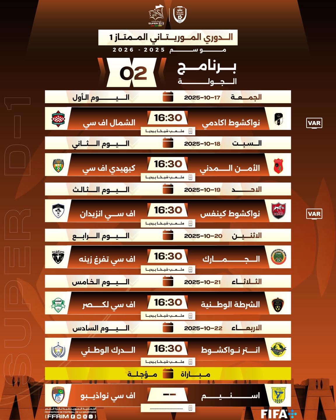 وتختتم الجولة بلقاء يجمع إنتر نواكشوط والدرك الوطني يوم 22 أكتوبر.