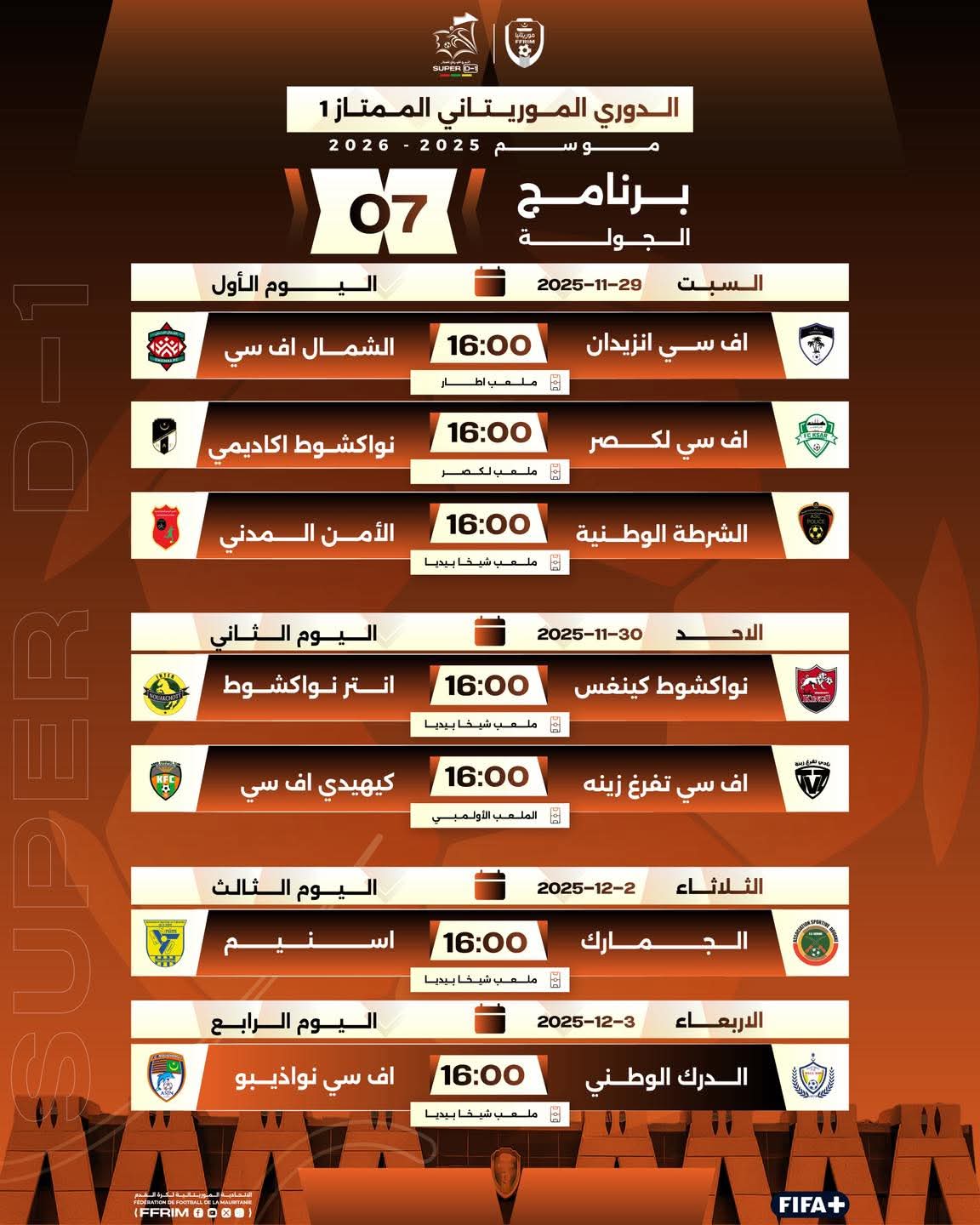 الأخبار (نواكشوط) أعلن الاتحاد الموريتاني لكرة القدم، عن البرنامج الرسمي لمنافسات الأسبوع السابع من بطولة الدوري الممتاز لموسم 2025-2026، وذلك على النحو التالي: