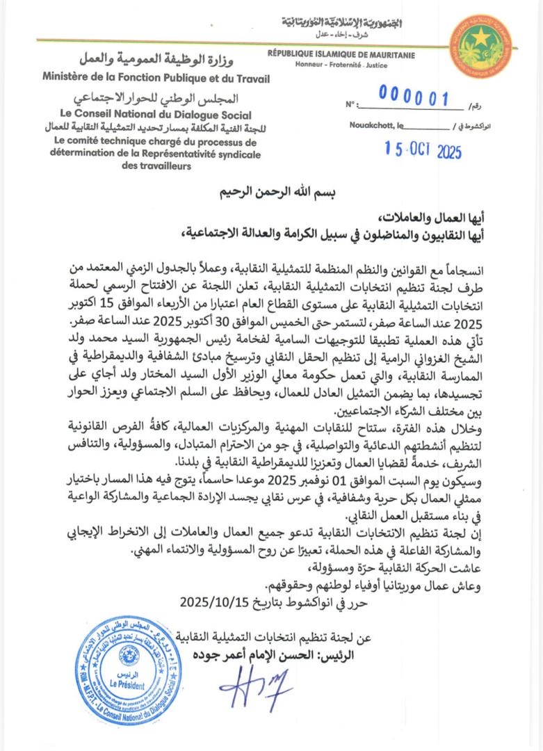 وأضافت اللجنة أن العملية تأتي تطبيقا لتوجيهات الرئيس محمد ولد الغزواني الرامية “إلى تنظيم الحقل النقابي وترسيخ مبادئ الشفافية والديمقراطية في الممارسة النقابية”.