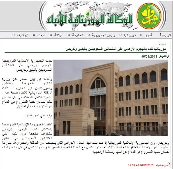 “تلقت الجمهورية الإسلامية الموريتانية، باستنكار شديد، أنباء الهجوم الإرهابي، بطائرات مفخخة دون طيار، على معمل للغاز الطبيعي بحقل الشيبة في شرق المملكة العربية السعودية.