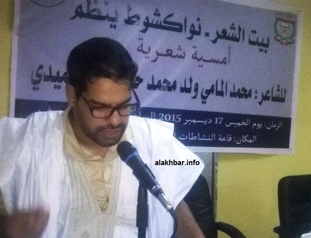 الأمسية المنظمة مساء أمس الخميس 17 – 12 – 2015 عرفت إلقاء الشاعر ولد محمد حامد للعديد من قصائده أمام الجمهور الشعري والفني والإعلامي، حيث تفاعل مع الجمهور بحماس.