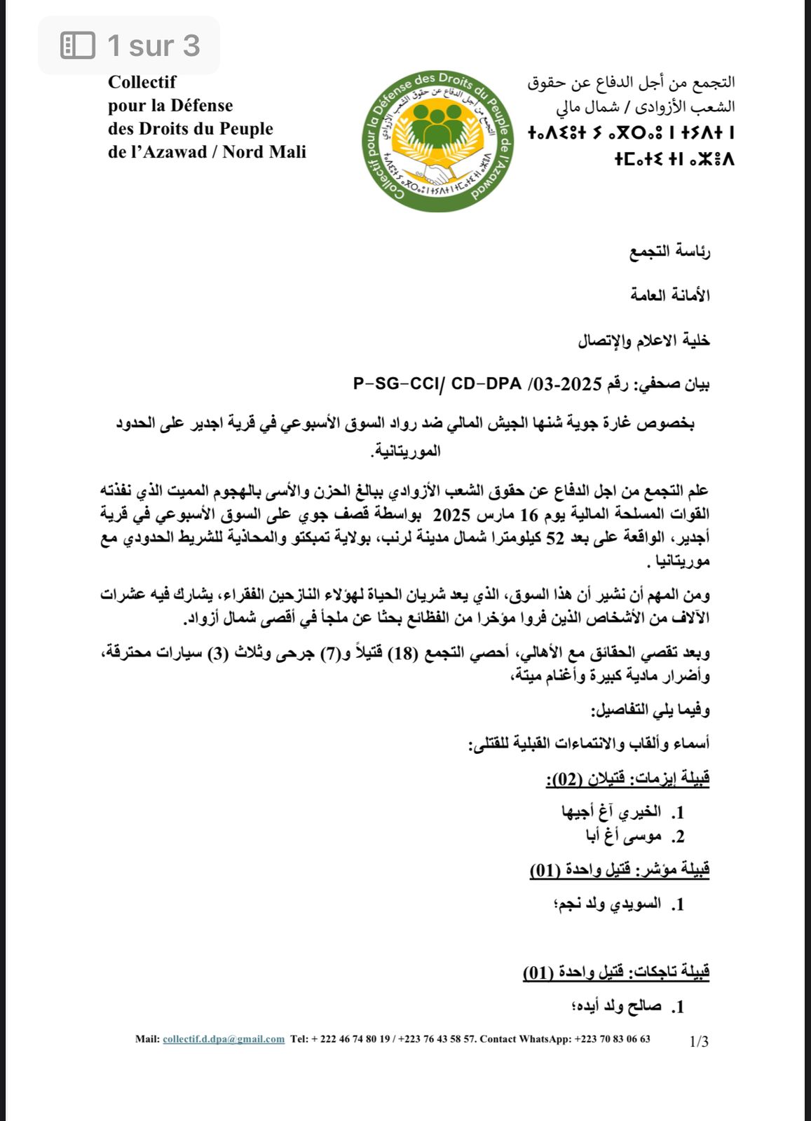 الأخبار (باماكو) – أعلن التجمع من أجل الدفاع عن حقوق الشعب الأزوادي، أن الهجوم الذي نفذته القوات المسلحة المالية يوم الأحد الماضي، على سوق محلي في قرية “اجدير” قرب الحدود مع موريتانيا، خلف 18 قتيلا، وما يزال 10 آخرون في عداد المفقودين.