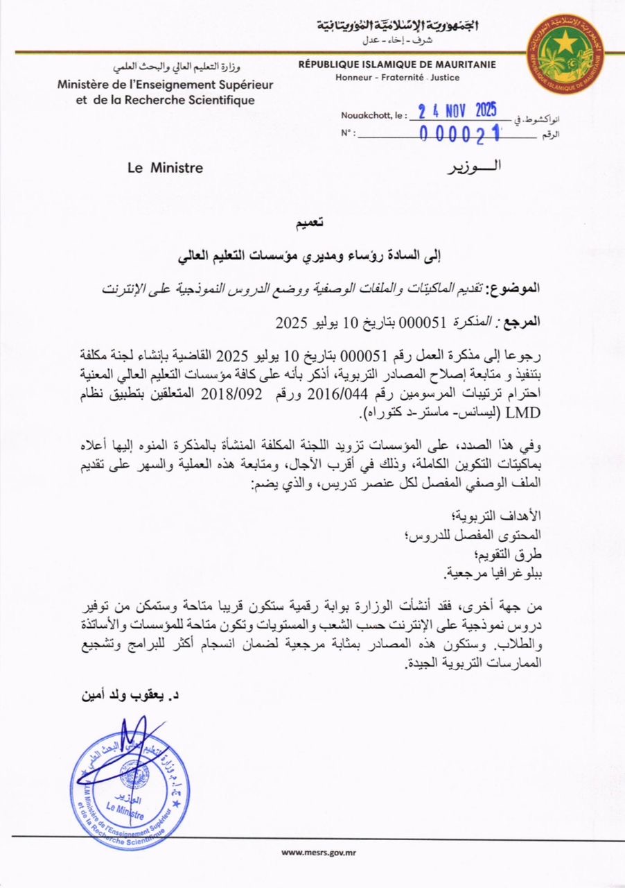الأخبار (نواكشوط) – أصدر وزير التعليم العالي والبحث العلمي يعقوب ولد مين تعميمًا يوجّه مؤسسات التعليم العالي إلى تقديم الماكيتات والملفات الوصفية، ووضع الدروس النموذجية على الإنترنت.