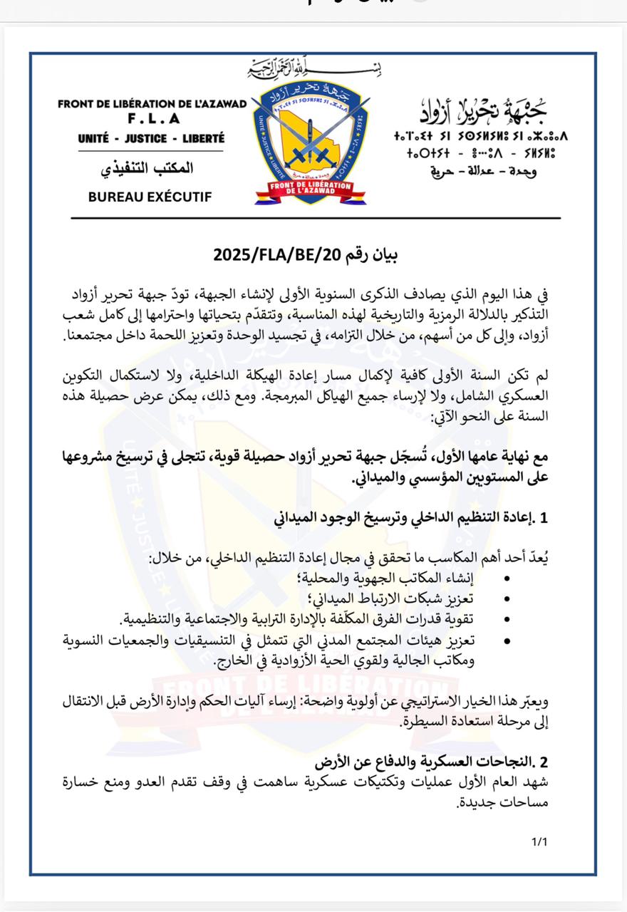 الأخبار (نواكشوط) – أعلنت جبهة تحرير أزواد اليوم الأحد حصيلة أدائها المؤسسي والميداني، وذلك بمناسبة مرور الذكرى الأولى لإنشائها.