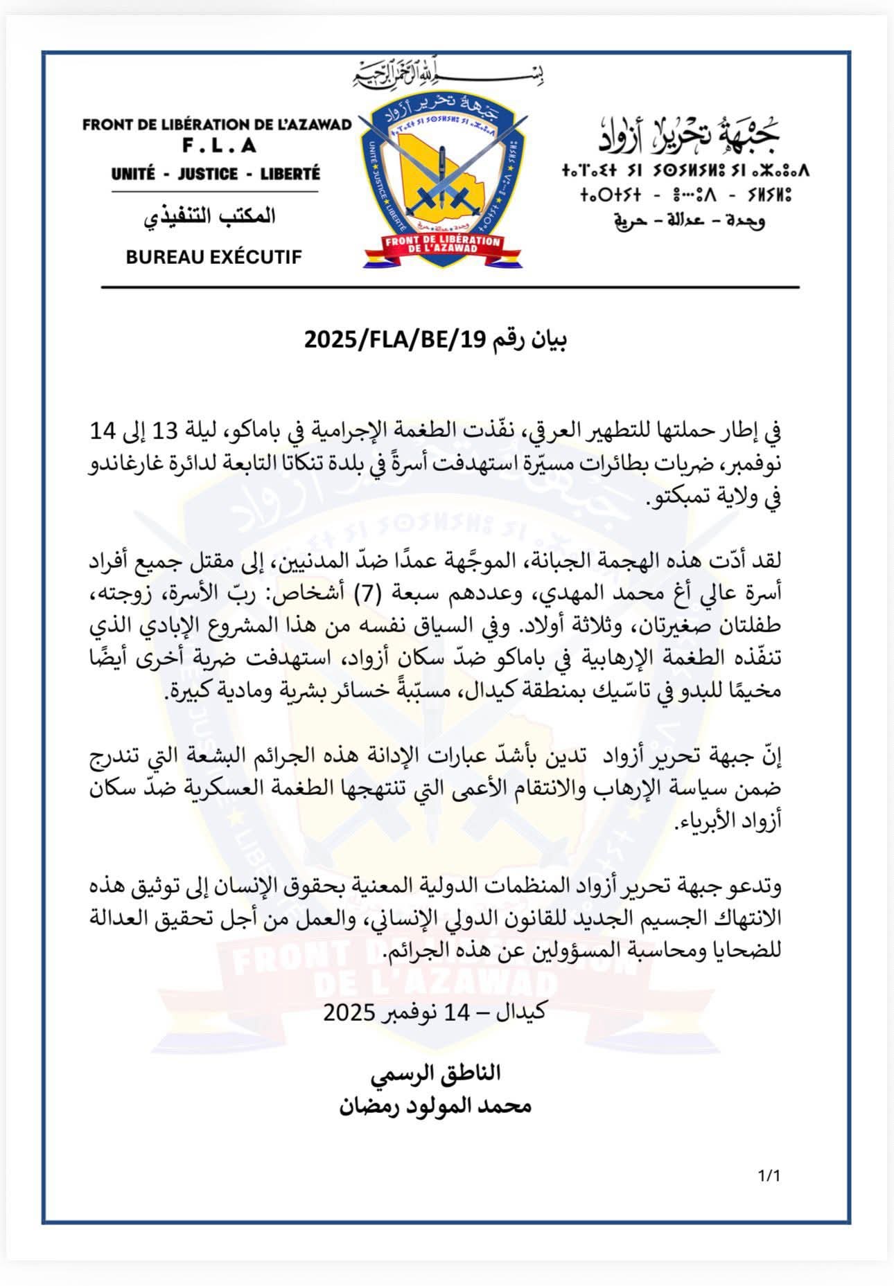 وعبرت الجبهة عن إدانتها “بأشد عبارات الإدانة لهذه الجرائم البشعة، التي تندرج ضمن سياسة الإرهاب والانتقام الأعمى، التي تنتهجها الطغمة العسكرية ضد سكان أزواد الأبرياء”.