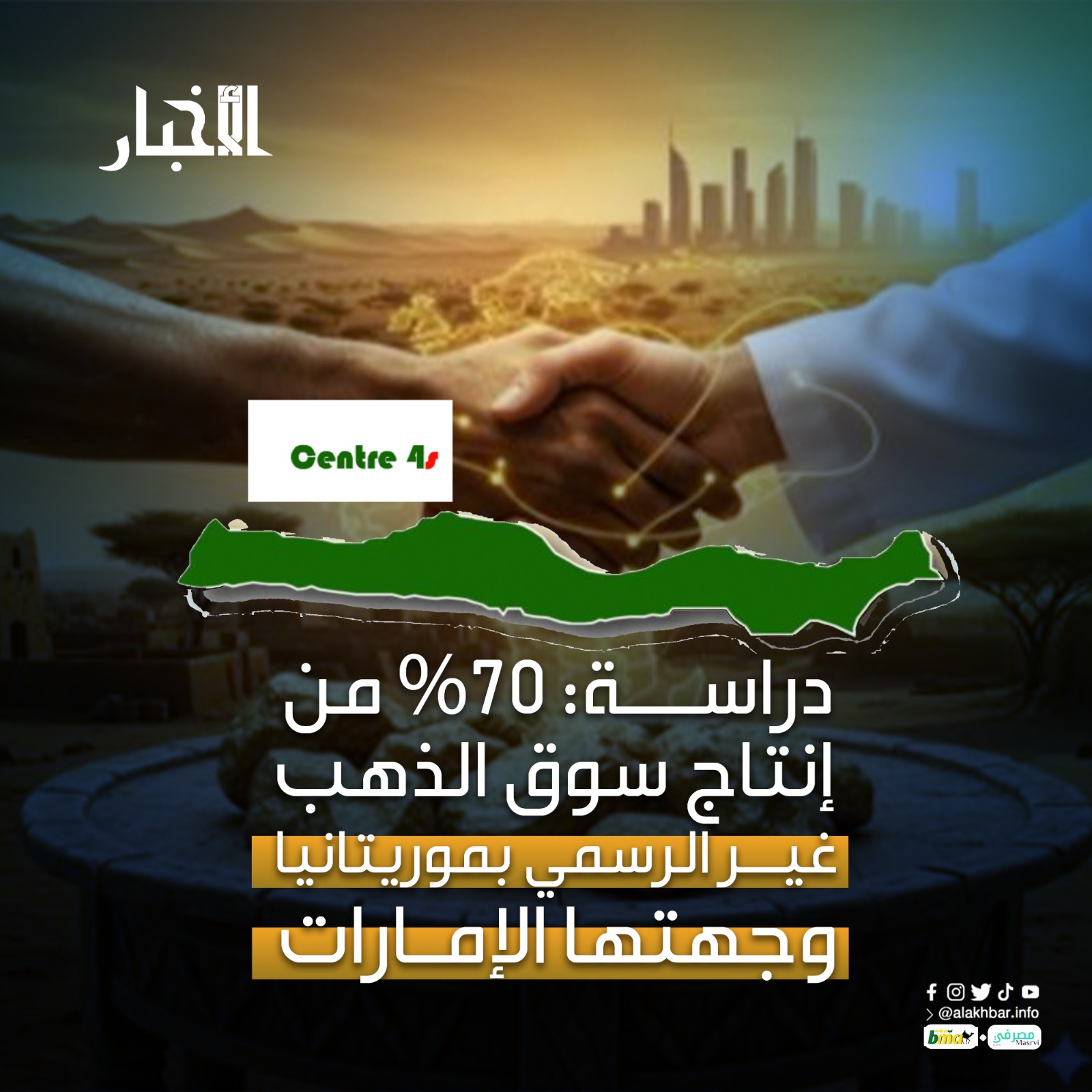 الأخبار (نواكشوط) – أكدت دراسة صادرة حديثا عن مركز استراتيجيات أمن منطقة الساحل والصحراء أن ما يصل إلى 70% من إنتاج السوق غير الرسمي للذهب في موريتانيا يتجه إلى مدينة دبي بالإمارات العربية المتحدة.