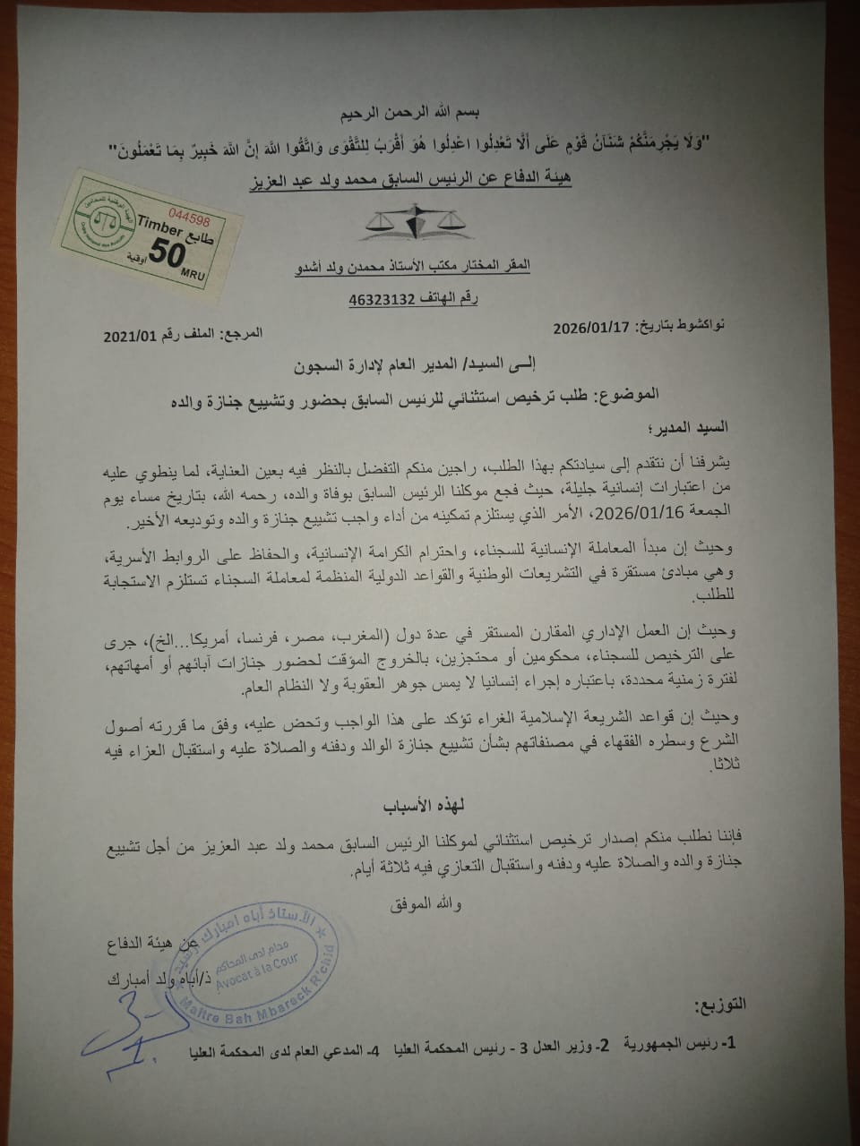 جاء ذلك في رسالة وجهها فريق الدفاع للإدارة العامة للسجون طالب فيها بترخيص استثنائي لولد عبد العزيز يتيح له حضور صلاة الجنازة على والده واستقبال التعازي لمدة ثلاثة أيام.