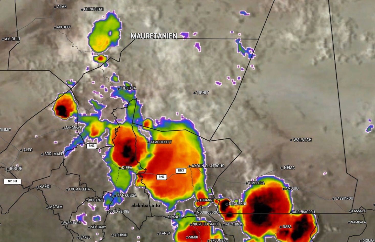 وعلى منطقة التقاطع بين ولايات العصابة وتكانت والبراكنة تكوَّنت سحب نشطة أخرى، وهي تقترب الآن من مدينتي صنكرافة ومكطع الحجار، وتتحرك نحو الجنوب الغربي، ويتوقع بإذن الله تعالى أن تؤدي إلى تهاطل أمطار من متوسطة إلى غزيرة على ولايتي البراكنة والترارزة.