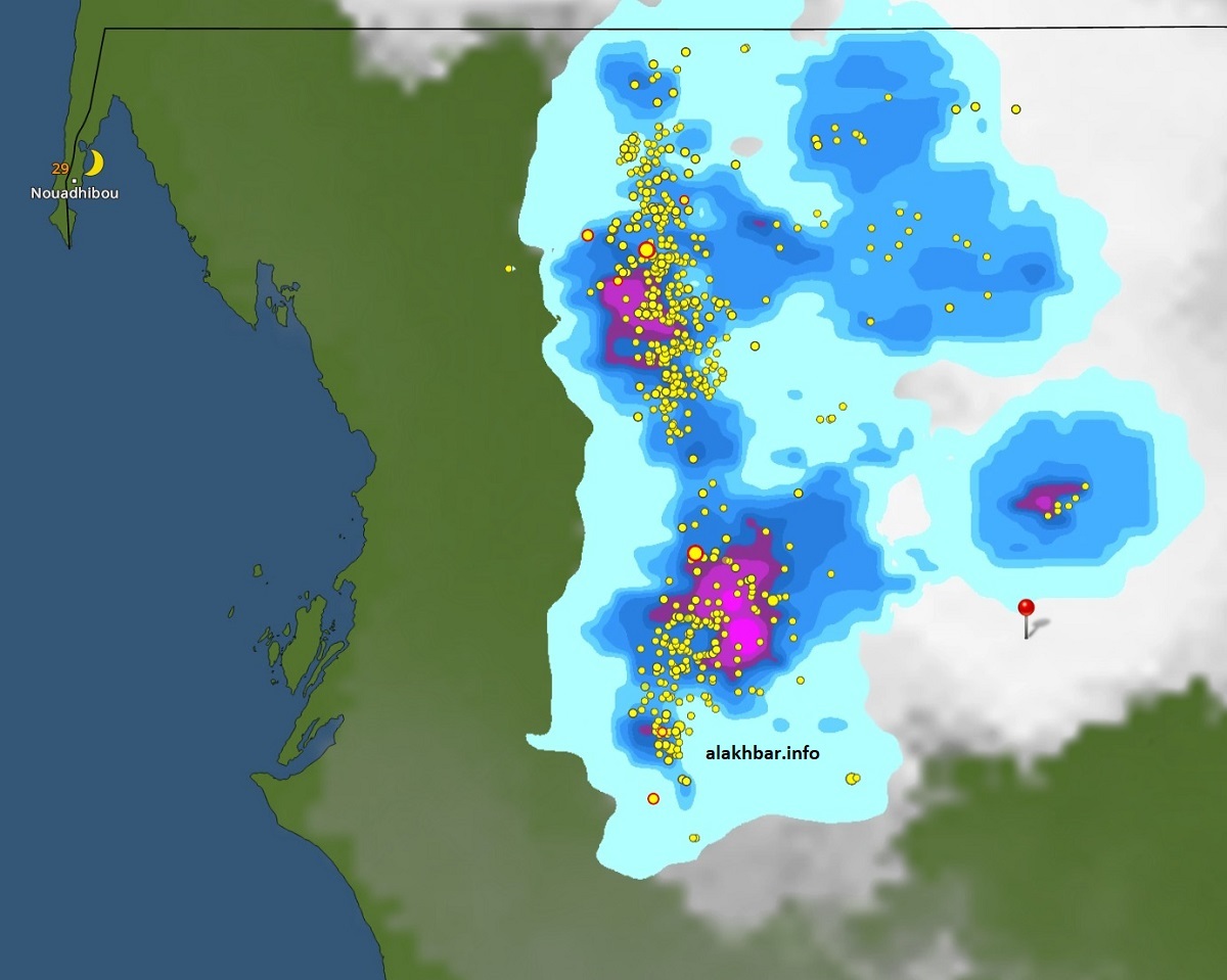 ووفق المعطيات المتوفرة، فإن سحبا ماطرة مصحوبة بعواصف رعدية، تقدمت من غرب ولاية آدرار، وتكاد الآن تعم ولاية إتشيري، وتتحرك نحو الجنوب الغربي، حيث يتوقع أن تغطي المنطقة الممتدة من شمال ولاية الترارزة، وحتى ولاية داخلت نواذيبو غربا وشمالا، وستغطي مناطق واسعة من ولايتي إنشيري وداخلت نواذيبو.