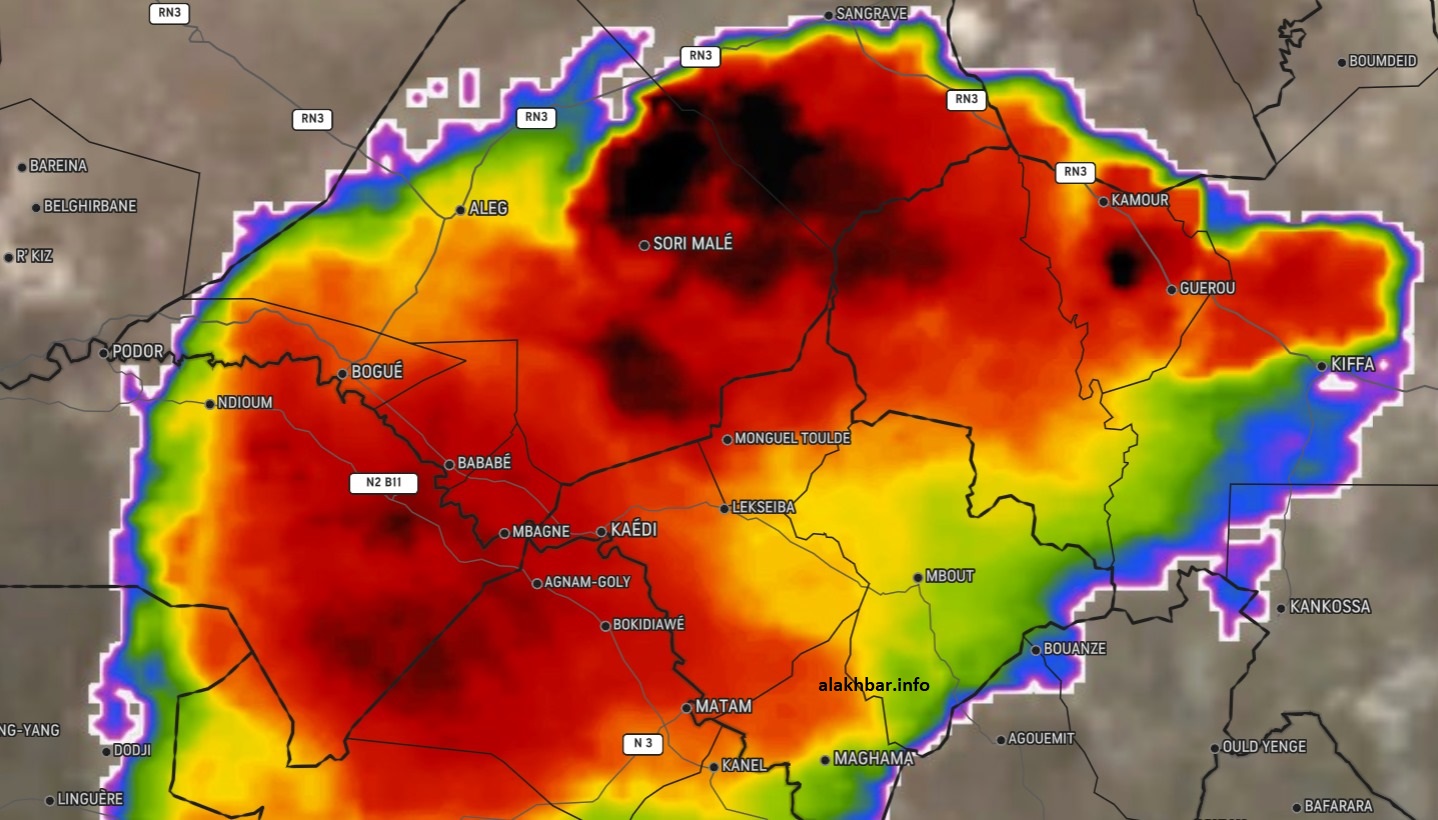 ووفق هذه المعطيات فما تزال هذه السحب تنشط الآن (11:00)، بكثافة متوسطة إلى عالية على ولاية البراكنة، وعلى مناطق واسعة من العصابة، وعلى ولاية كوركل.