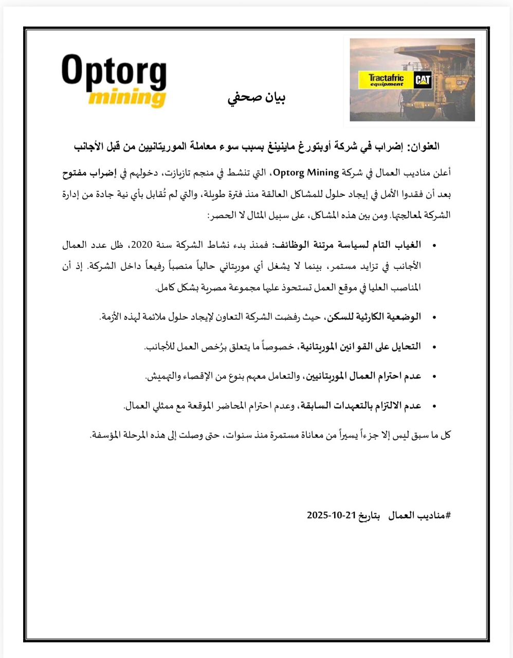 وأشار البيان إلى ما وصفه بالوضعية المزرية لسكن العمال، وعدم التزام الشركة بالقوانين الموريتانية، خاصة ما يتعلق برخص العمل للأجانب، إضافة إلى أسلوب الإقصاء الذي يُمارس ضد العمال المحليين.