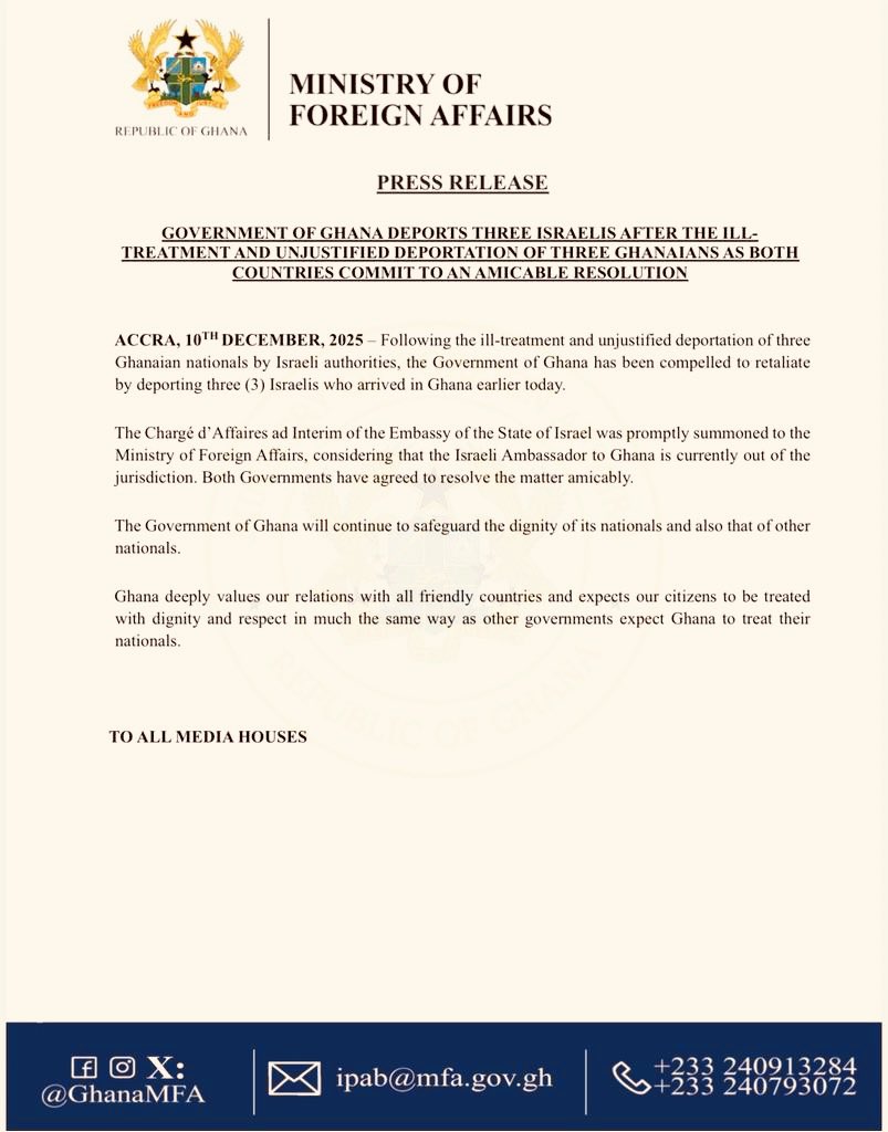 الأخبار (أكرا) – أعلنت غانا ترحيل 3 إسرائيليين وصلوا البلاد الأربعاء، وذلك ردا بالمثل على “إساءة معاملة وترحيل 3 مواطنين غانيين دون مبرر من قبل السلطات الإسرائيلية”.