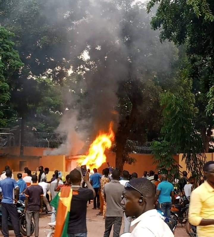 وأضرم عدد من المتظاهرين الغاضبين مساء اليوم النار عند مدخل مبنى السفارة الفرنسية في واغادوغو، وأحرق بعضهم العلم الفرنسي.