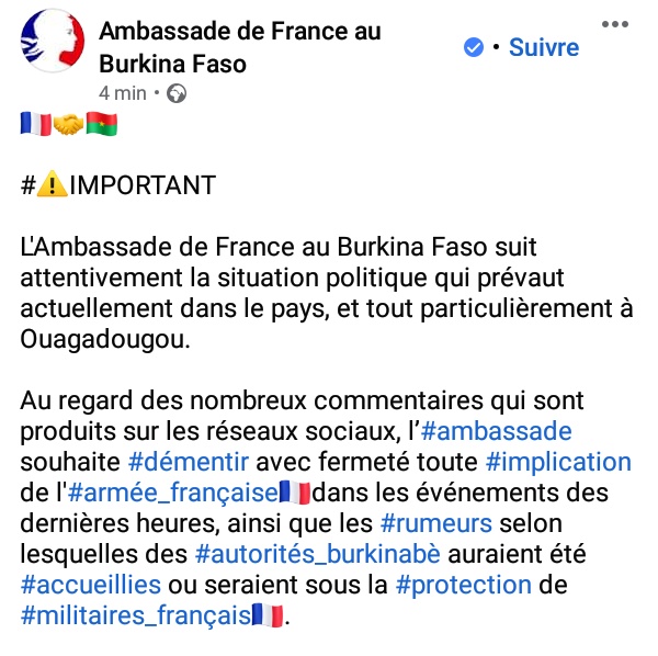 وأوضحت السفارة الفرنسية لدى واغادوغو في بيان مقتضب نشرته على صفحتها على “تويتر” أنها “تتابع بعناية الوضع السياسي السائد حاليا في البلاد، وخصوصا في واغادوغو”.