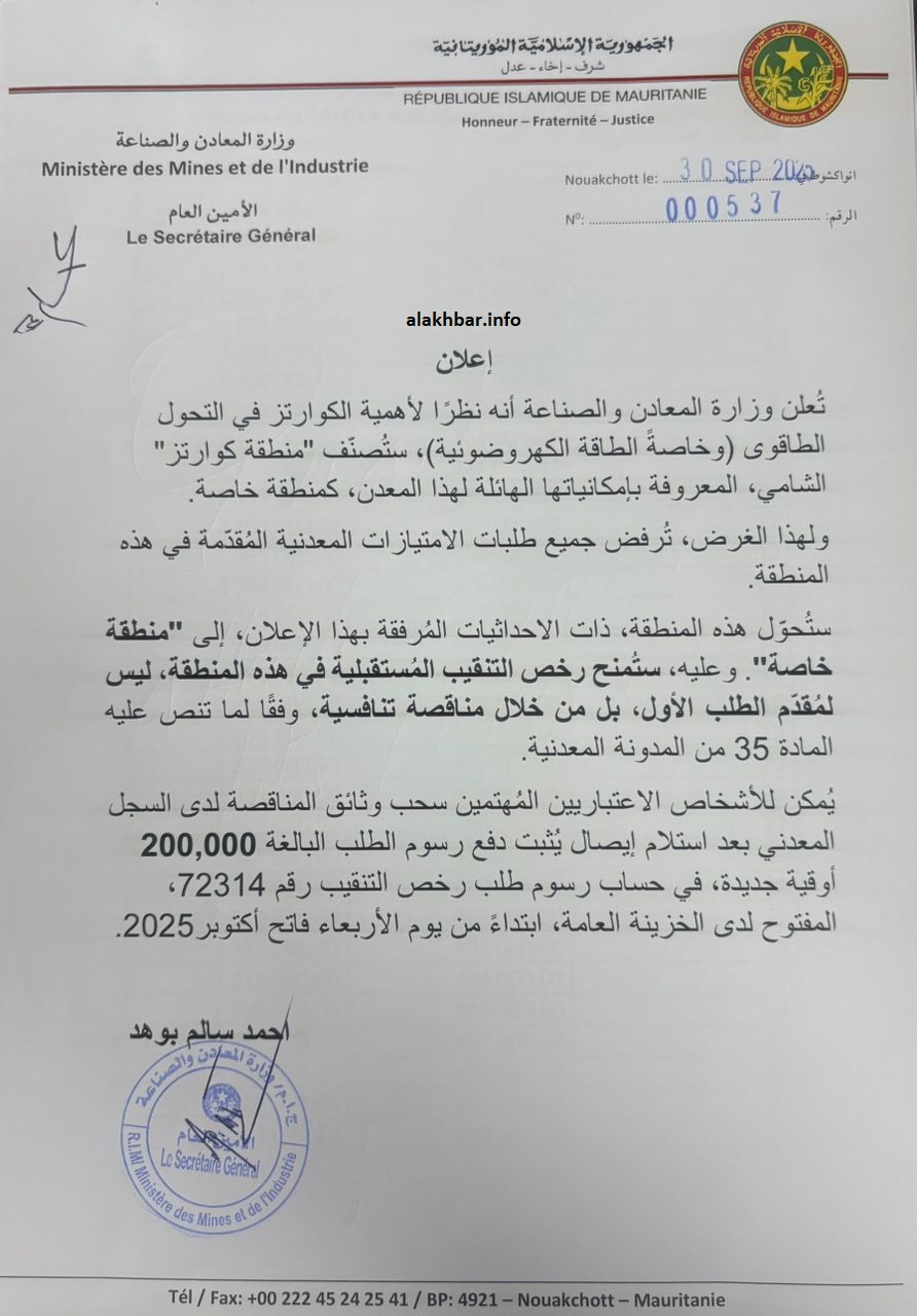 الأخبار (نواكشوط) – كشفت وزارةُ المعادن والصناعة عن قرار حكومي يقضي بتصنيف منطقة “لكوارتز” بالشامي في ولاية داخلت نواذيبو “منطقة خاصة”.