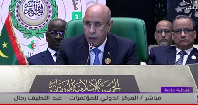 وإننا في الجمهورية الإسلامية الموريتانية لنجدد تمسكنا الثابت بضرورة إيجاد حل دائم سريع وعادل يضمن حق الشعب الفلسطيني في تأسيس دولته المستقلة وعاصمتها القدس الشرقية طبقا لمبادئ القانون الدولي وقرارات مجلس الأمن ومبادرة السلام العربية، ونحن نستبشر خيرا بما تم توقيعه مؤخرا من اتفاق مصالحة بين الفصائل الفلسطينية برعاية الجمهورية الجزائرية الديمقراطية الشعبية الشقيقة، كما ندعو إلى إيجاد حلول سياسية سليمة للنزاعات المسلحة في اليمن وسوريا وليبيا على نحو يضمن لهذه البلدان وحدة وسلامة أراضيها وحق شعوبها في التمتع بالاستقرار والأمن والنماء، فبدون الأمن والاستقرار في كامل الفضاء العربي لن نصل بالعمل العربي المشترك إلى المستوى الذي تتطلع إليه شعوبنا وتمليه الإكراهات المثالة والتحديات المستقبلية.