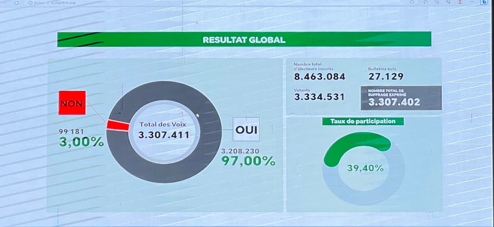ووفق الأرقام الرسمية، فقد بلغ عدد الأصوات اللاغية 27129، وبالتالي فإن الأصوات المعبر عنها هي 3307402، بينها 3208230 صوتوا ب”نعم” للدستور الجديد، وهو ما يمثل نسبة 97%.