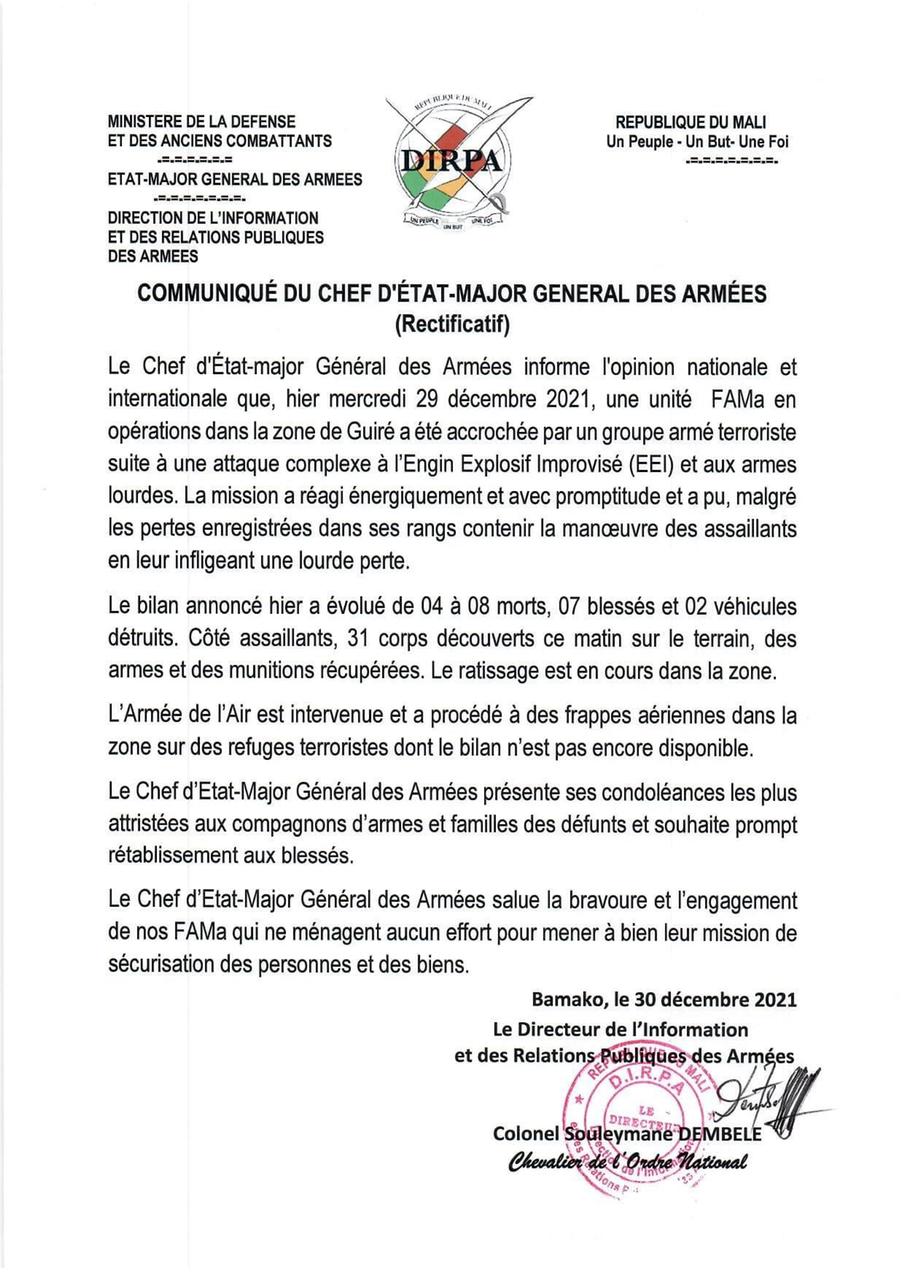 الأخبار (باماكو) – أعلنت هيئة الأركان العامة للجيوش المالية ارتفاع حصيلة جديدة للهجوم الذي كان تعرضت له وحدة من الجيش المالي الأربعاء بمنطقة “نارا” التابعة لولاية “كوليكورو” قرب الحدود مع موريتانيا.