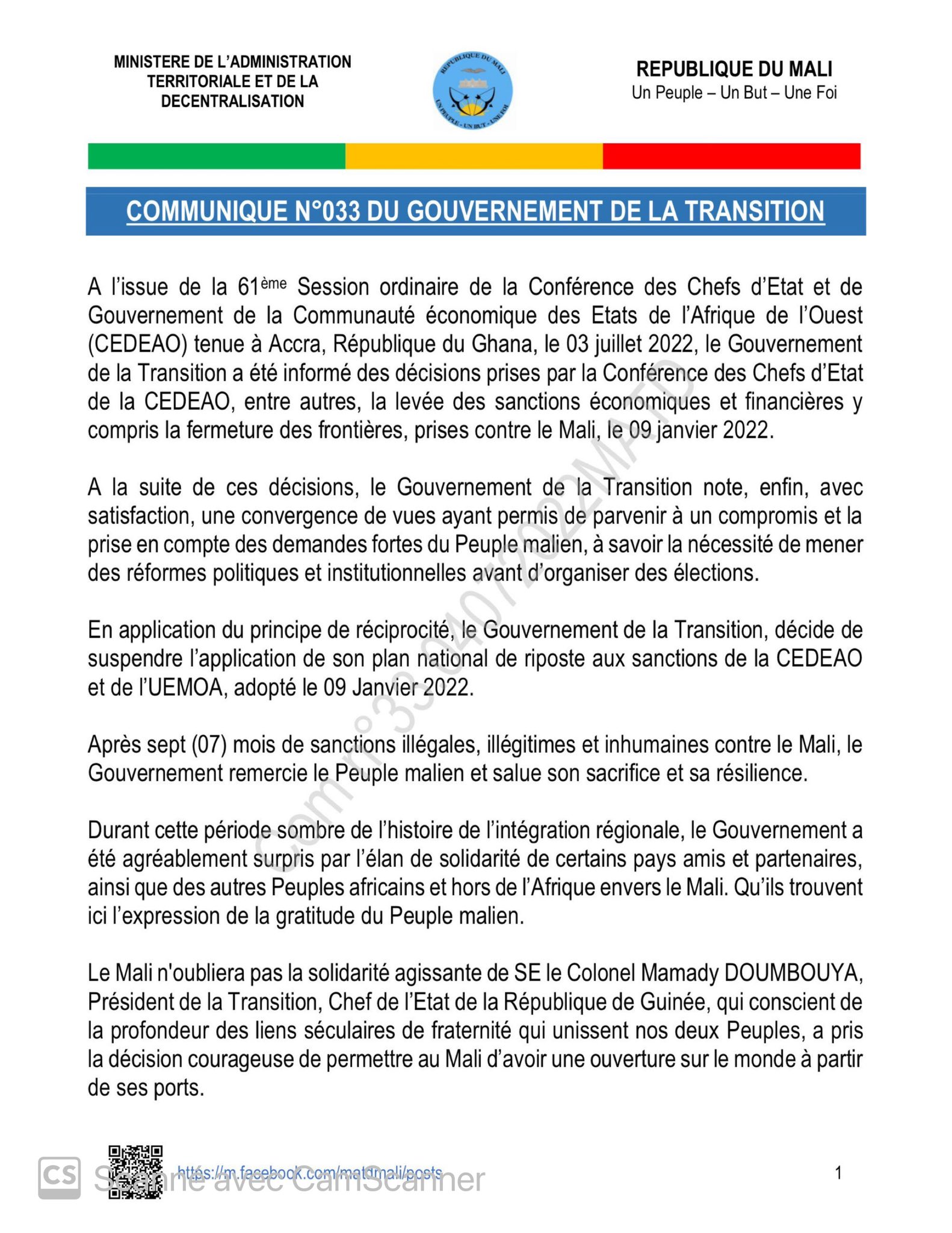 وقالت حكومة باماكو إنها “لن تنسى التضامن النشط” للعقيد مامادي دومبويا الرئيس الانتقالي لغينيا كوناكري “لإدراكه عمق روابط الأخوة التي توحد شعبينا، واتخاذه قرارا شجاعا بجعل مالي مفتوحة على العالم عبر الموانئ الغينية”.