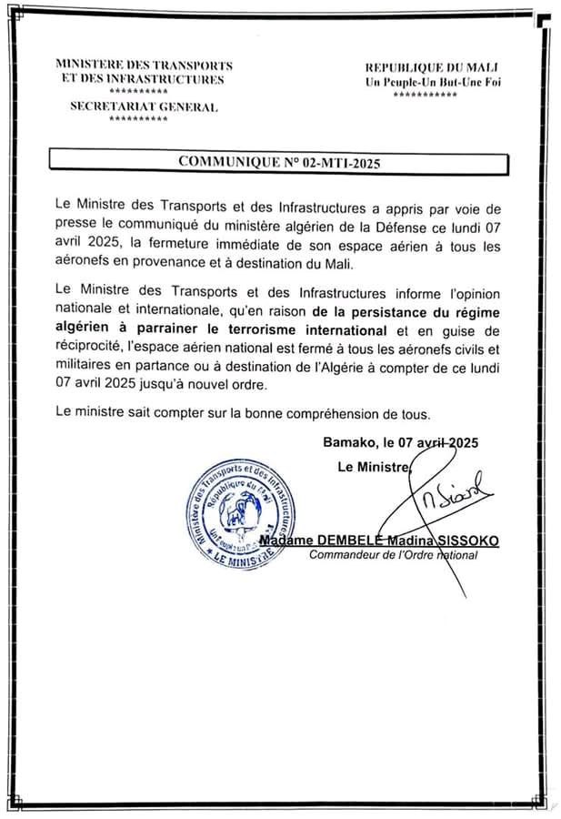 الأخبار (باماكو) – أعلنت الحكومة المالية إغلاق المجال الجوي للبلاد أمام “كل الطائرات المدنية والعسكرية المتجهة إلى الجزائر أو القادمة منها، ابتداء من الاثنين 7 أبريل 2025، وحتى إشعار آخر”.