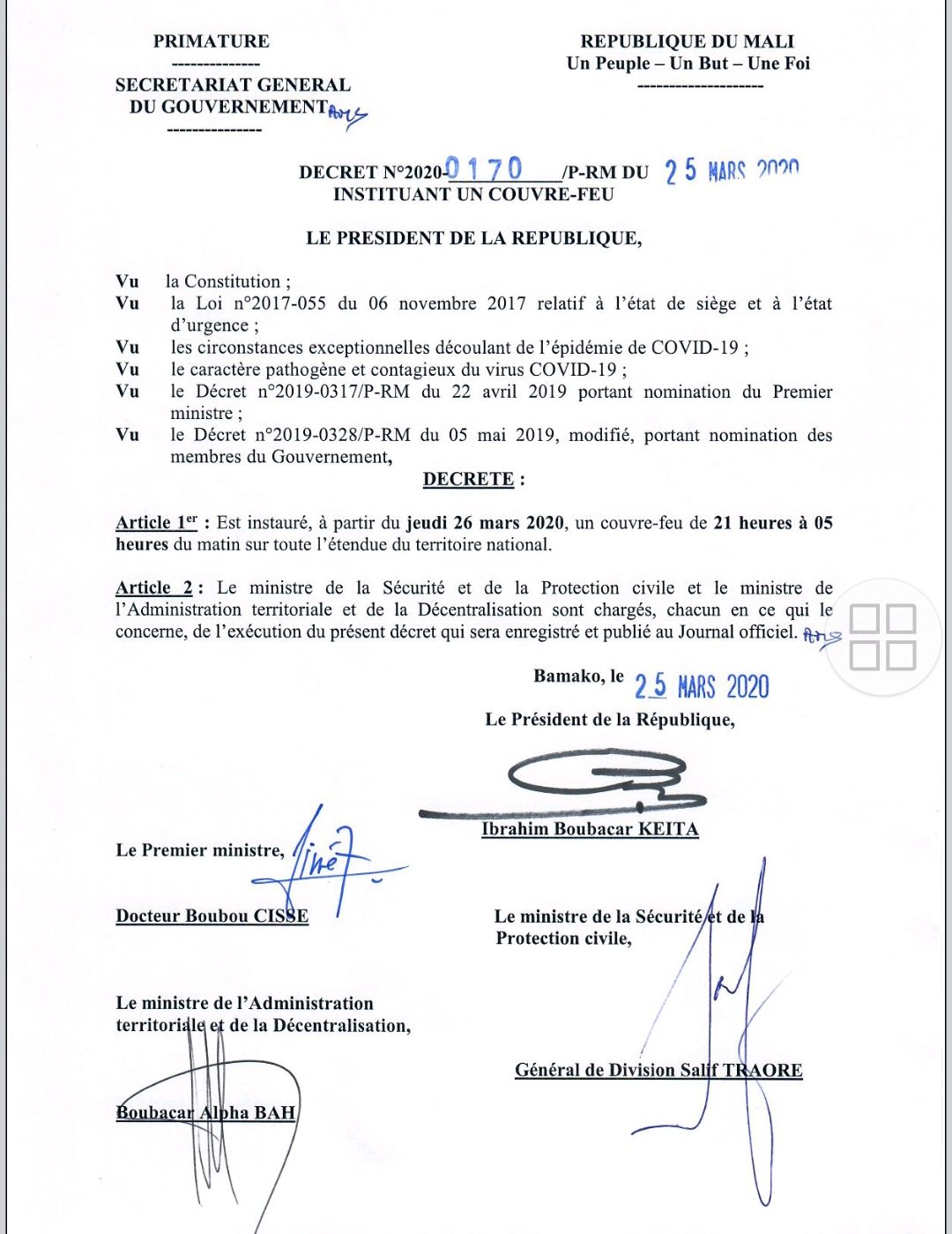 الأخبار (باماكو) – أقرت الرئاسة المالية إجراء يتعلق بحظر التجوال يوميا في البلاد، من التاسعة مساء إلى الخامسة صباحا، وذلك بدءا من اليوم الخميس.