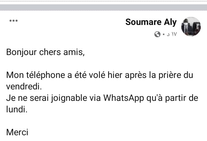 الأخبار (نواكشوط) – أكد الأمين العام لوزارة التهذيب الوطني وإصلاح النظام التعليمي عالي سومارى سرقة هاتفه عقب صلاة الجمعة أمس.