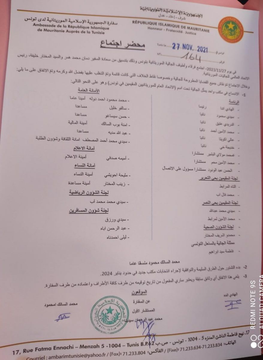 الأخبار (نواكشوط) – أعلنت الجالية الموريتانية في تونس عن مكتب توافقي، بعد اتفاق بين المكتبين اللذين أعلن عنهما منذ فترة، وتم توقيع الاتفاق برعاية السفارة الموريتانية في تونس، واتحاد مكاتب الجاليات الموريتانية حول العالم.