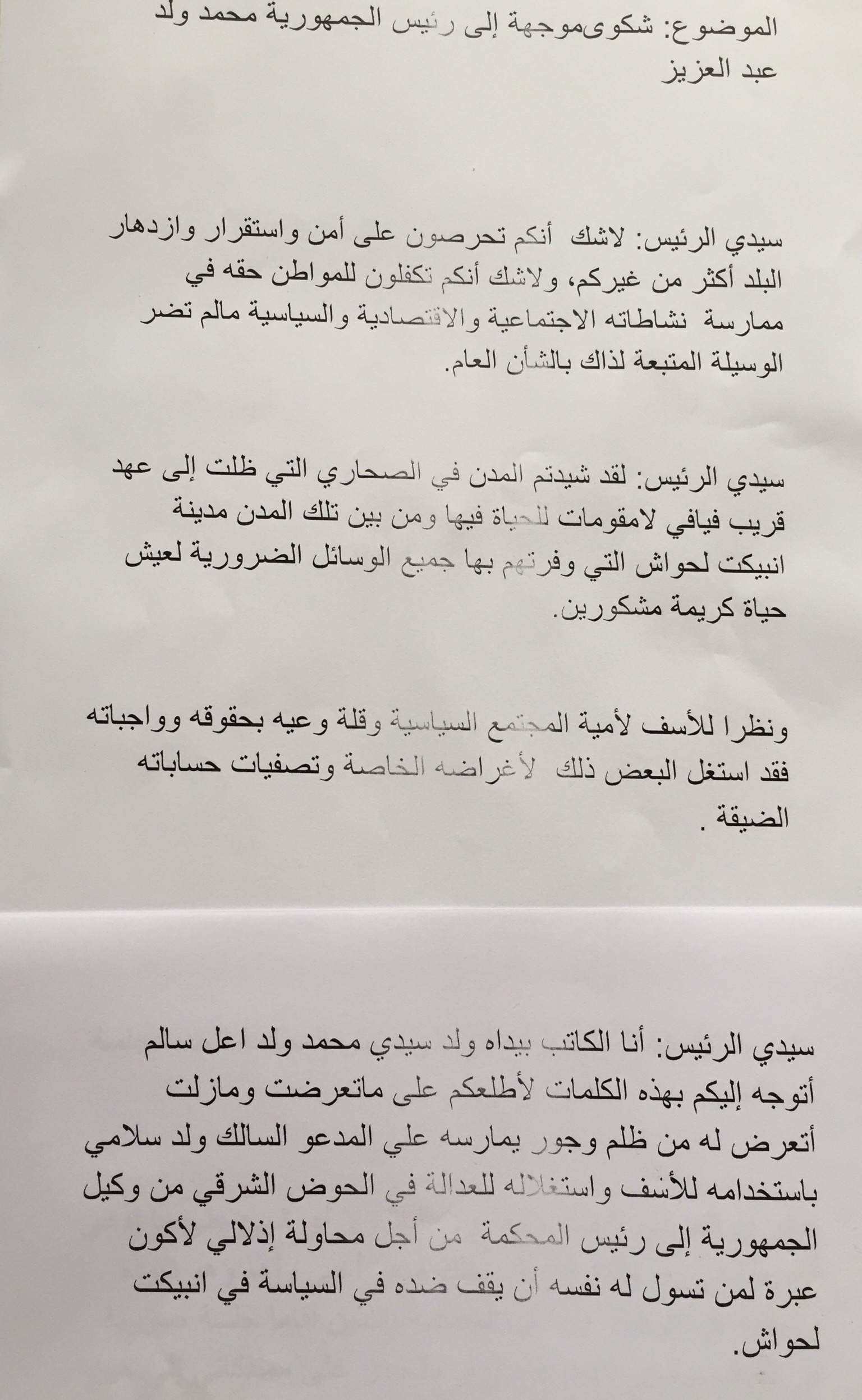 سيدي الرئيس: أنا الكاتب بيداه ولد سيدي محمد ولد اعل سالم أتوجه إليكم بهذه الكلمات لأطلعكم على ماتعرضت ومازلت أتعرض له من ظلم وجور يمارسه علي المدعو السالك ولد سلامي باستخدامه للأسف واستغلاله للعدالة في الحوض الشرقي من وكيل الجمهورية إلى رئيس المحكمة من أجل محاولة إذلالي لأكون عبرة لمن تسول له نفسه أن يقف ضده في السياسة في انبيكت لحواش.