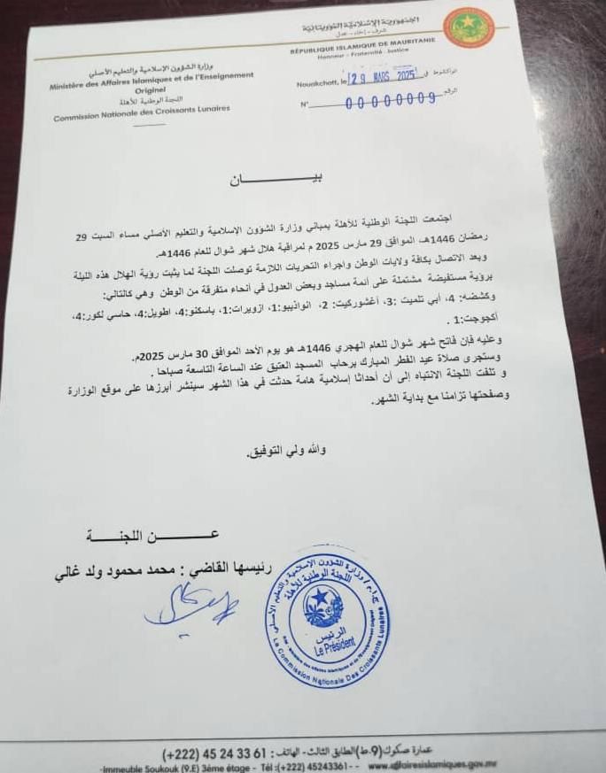 الأخبار (نواكشوط) – أعلنت اللجنة الوطنية لمراقبة الأهلة يوم غد الأحد عيد الفطر المبارك.