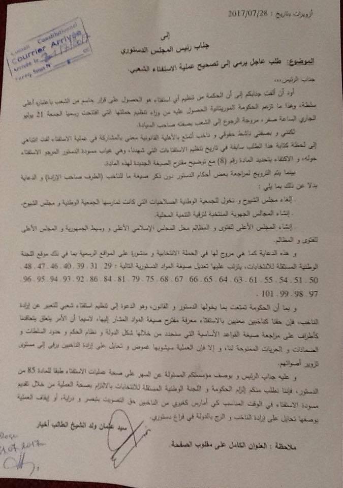 الأخبار (نواكشوط) – وجه الناشط الحقوقي سيد عثمان ولد الشيخ الطالب اخيار، طلبا إلى المجلس الدستوري يطلب من خلاله إلزام الحكومة و اللجنة الوطنية المستقلة للانتخابات بتصحيح مسار تنظيم عملية الاستفتاء أو إلغائها.