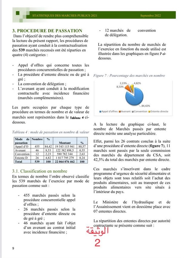 وتعكس الإحصائيات التي أجرتها منظمتنا ارتفاعا ملحوظا وجنوحا لصفقات التراضي، حيث بلغت القيمة الإجمالية لها في سنة 2022: 129.917.310.550 أوقية قديمة، وفي سنة 2021: 109.268.619.770 أوقية قديمة، مسجلة ارتفاعا كبيرا مقارنة بسنة 2020 حيث بلغت 40 مليارا فقط.