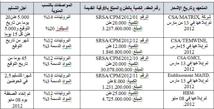 تم إبرام الصفقات الخمس المتضمنة في الجدول التالي لشراء أعلاف المواشي ضمن برنامج أمل 2012 – طبقا لما ورد في وثائق وإحصائيات الهيئات المسؤولة عن الصفقات:
