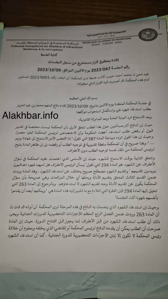 حيث إن الدفاع أثار مسألتين حول هذا الطلب تتعلق الأولى بأن المحكمة ليست مختصة في تقدير قبول أو رفض طلب استدعاء أعضاء الحكومة وأن الاختصاص لرئيس المحكمة العليا حصراء وحيث ان هذا القول ترده ديباجة المادة 587 التي تقول ” إذا اقتضى الأمر الاستماع إلى شهادة وزير .. وهذا صريح في أن للمحكمة سلطة تقديرية في توجيه الطلب أو رفضه، بل إن ظاهر المادة يتيح