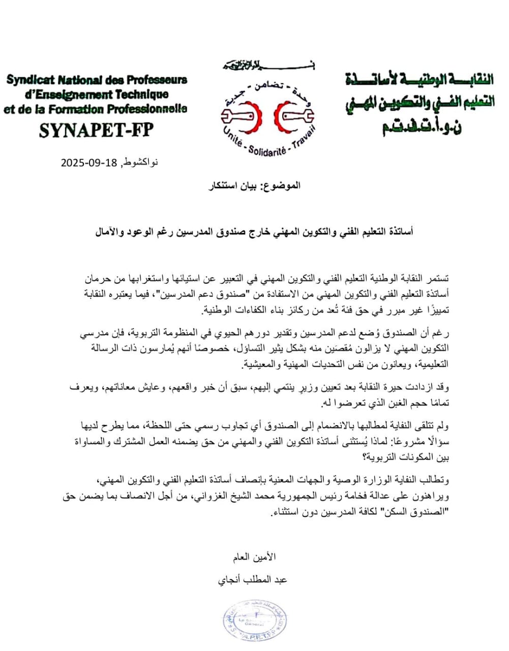 وعبّرت النقابة في بيان لها “عن استيائها واستغرابها من حرمان أساتذة التعليم الفني والتكوين المهني من الاستفادة من صندوق دعم المدرسين”، معتبرة ذلك تمييزا غير مبرر في حق فئة تعدّ من ركائز بناء الكفاءات الوطنية.