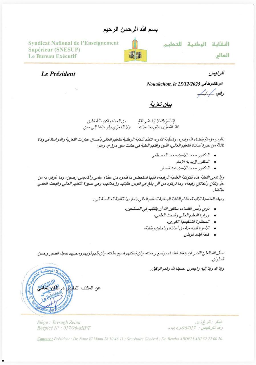 وتوجهت النقابة بتعازيها القلبية إلى ذوي وأُسر الفقـداء، المتمثلة في وزارة التعليم العالي والبحث العلمي، والمحظرة الشنقيطية الكبرى، والأسرة الجامعية من أساتذة وباحثين وطلبة، وكافة أبناء الوطن.