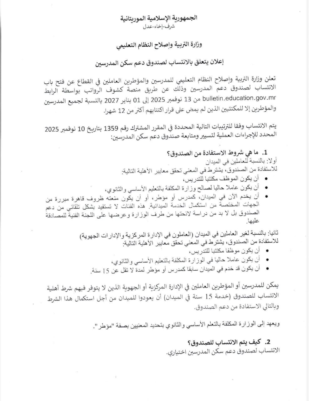 الأخبار (نواكشوط) أعلنت وزارة التربية وإصلاح النظام التعليمي عن فتح باب الانتساب لصندوق دعم سكن المدرسين والمؤطرين العاملين في القطاع.